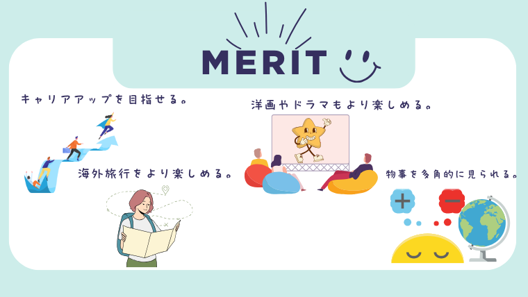 英語ができることで、キャリアアップが目指せる、海外旅行に難なく行ける、洋画やドラマを字幕無しでそのまま楽しめるなど、メリットだらけ。